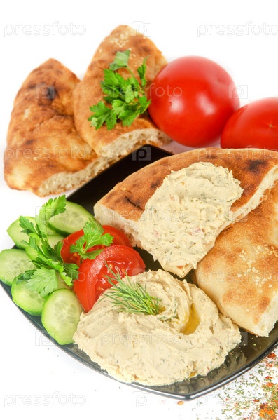 Лепешка с паштетом и свежими овощами на тарелке