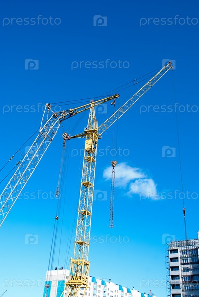 Подъемные краны и строящиеся дома на фоне голубого неба