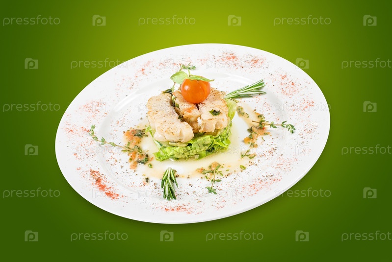 Салат из жареного филе судака с цукини, баклажанов и помидоров черри в белой тарелке на зеленом фоне