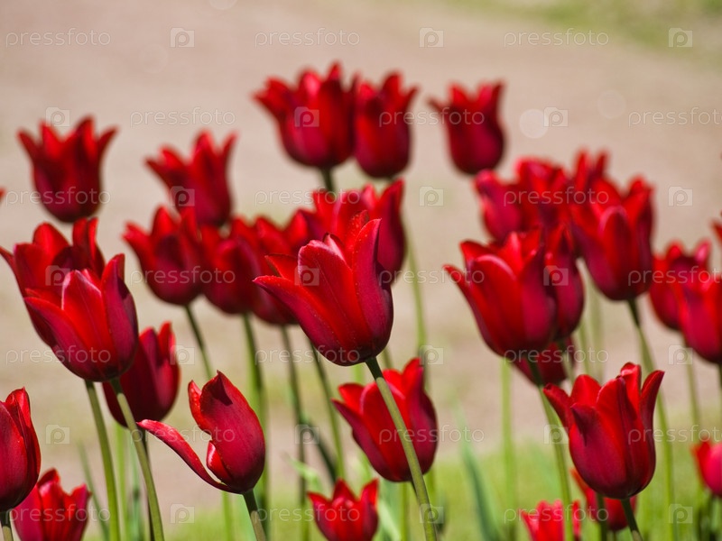 Многие ярко-красные декоративные тюльпаны на клумбе в парке