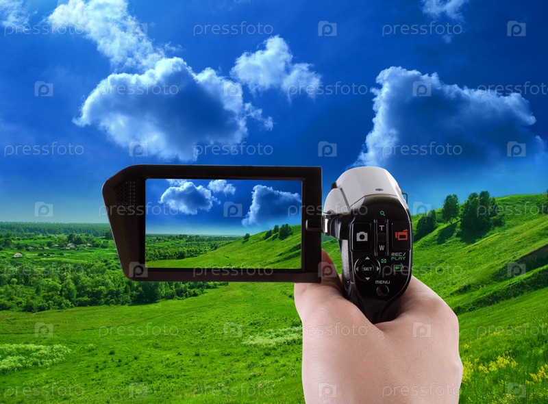 Оператор снимает летний пейзаж на видеокамеру, крупный план