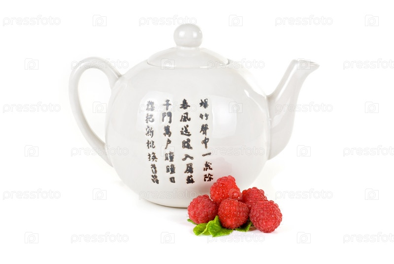 Белый чайник с иероглифами и ягоды малины на белом фоне