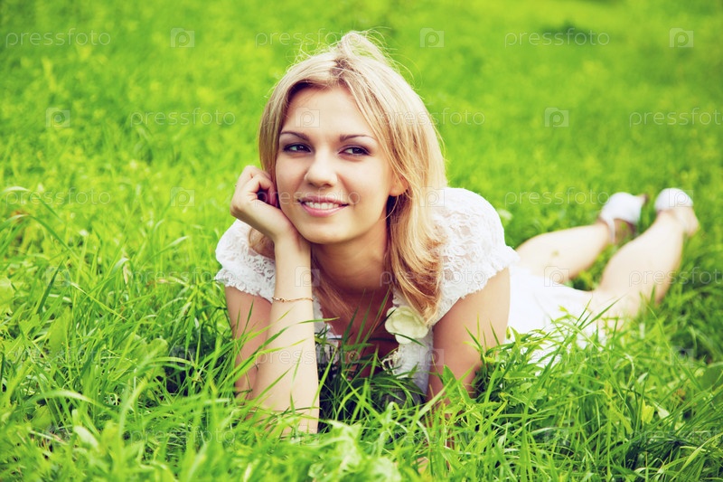 Молодая женщина лежит на зеленой траве