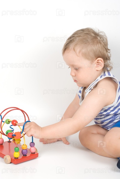 Маленький мальчик сидит и играет с игрушками на белом фоне