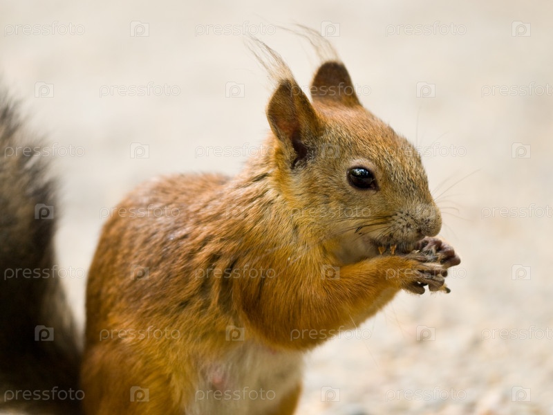 Красная белка сидит и ест орехи