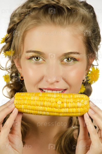 Красивая девушка с желтыми одуванчиками в волосах держит кукурузный початок