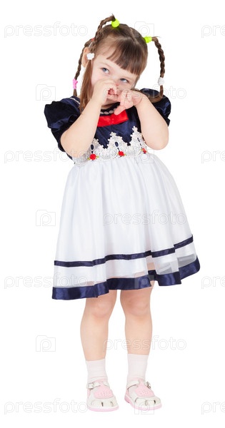 Застенчивая девочка в красивом платье на белом