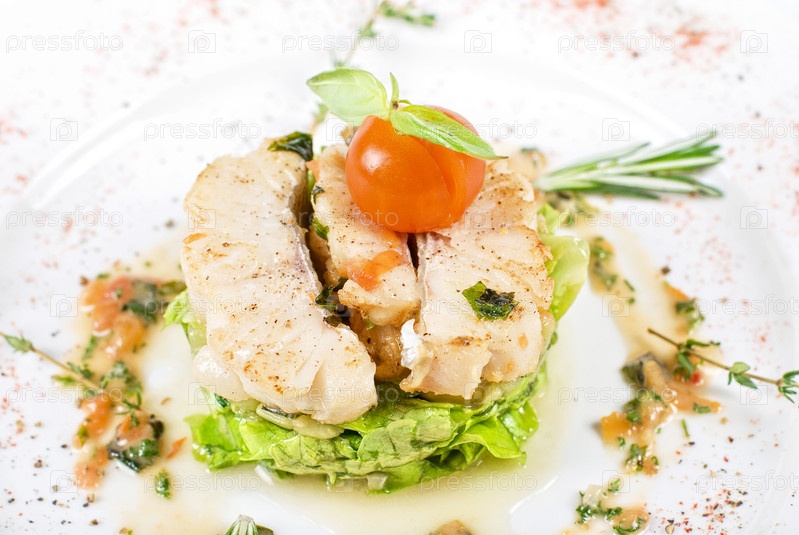 Салат из жареного филе судака с цукини, баклажанами и помидорами черри