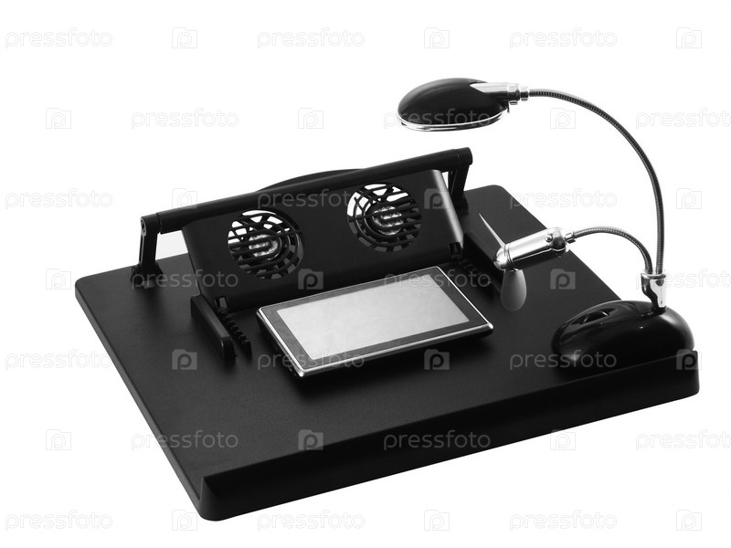 Планшетный компьютер на охлаждающей подставке с кулером и дополнительный вентилятор с лампой на белом фоне