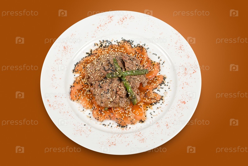 Салат из говядины с белыми грибами, фасолью, спаржей, шпинатом, помидорами и карпаччо на коричневом фоне