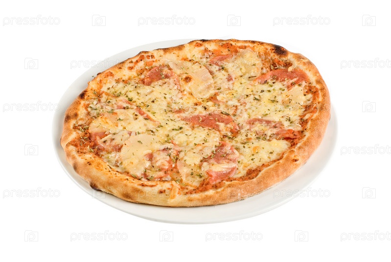 Пицца с грибами и ветчиной на белом фоне