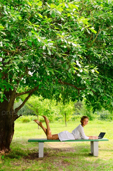 Красивая девушка с ноутбуком, лежащя под деревом на скамейке в парке