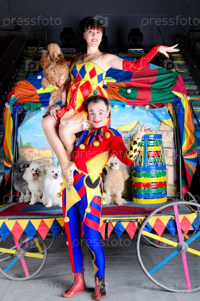 Веселый клоун Арлекин поднимает Коломбину с рыжим пуделем