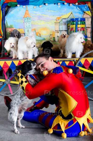 Грустный клоун Арлекин обнимает собаку