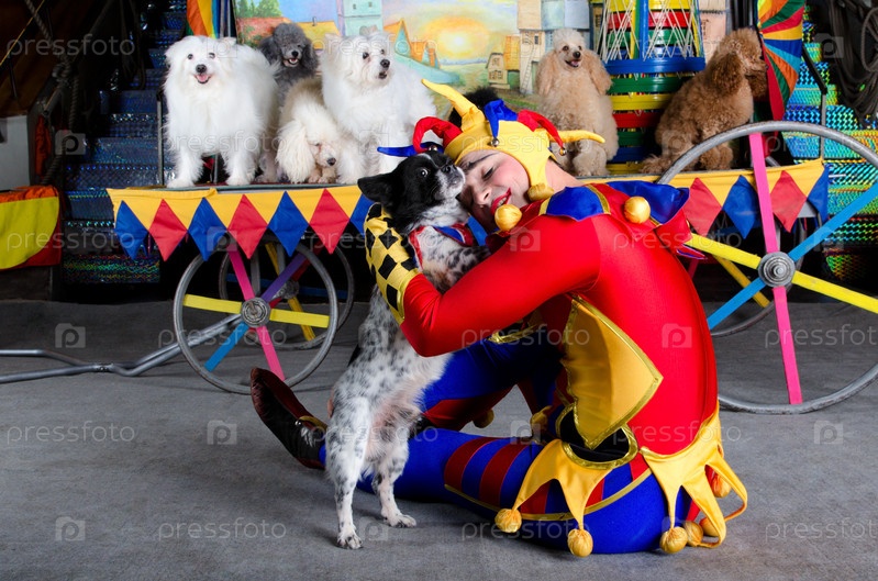 Улыбающийся клоун с закрытыми глазами обнимает собаку