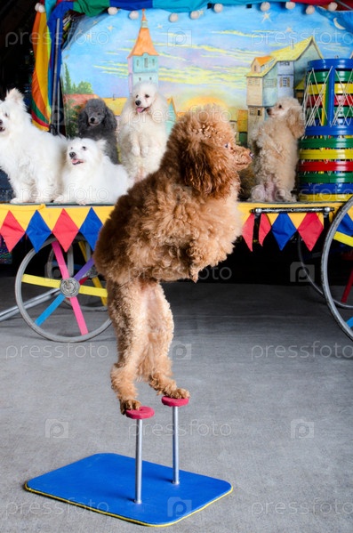 Рыжий пудель стоит на задних лапах