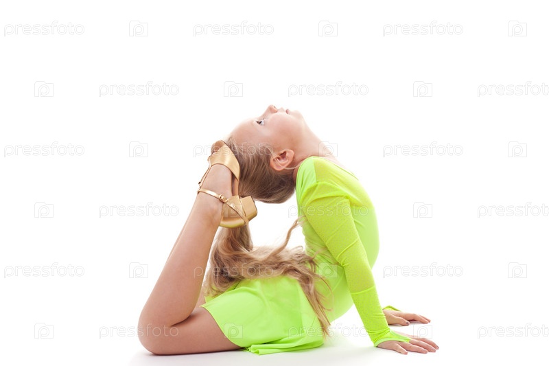 Гибкая маленькая гимнастка на белом фоне