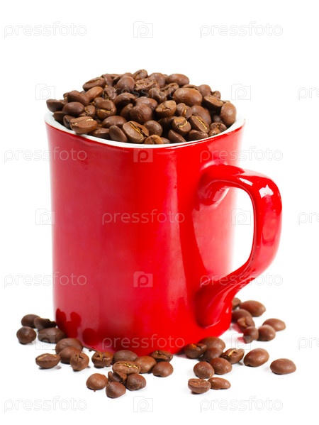 Кофе в зернах в красной кружке, изолировано на белом фоне