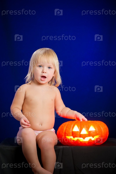 Милый ребенок с тыквой для хеллоуина на темном фоне