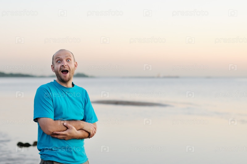Удивленный мужчина на морском побережье