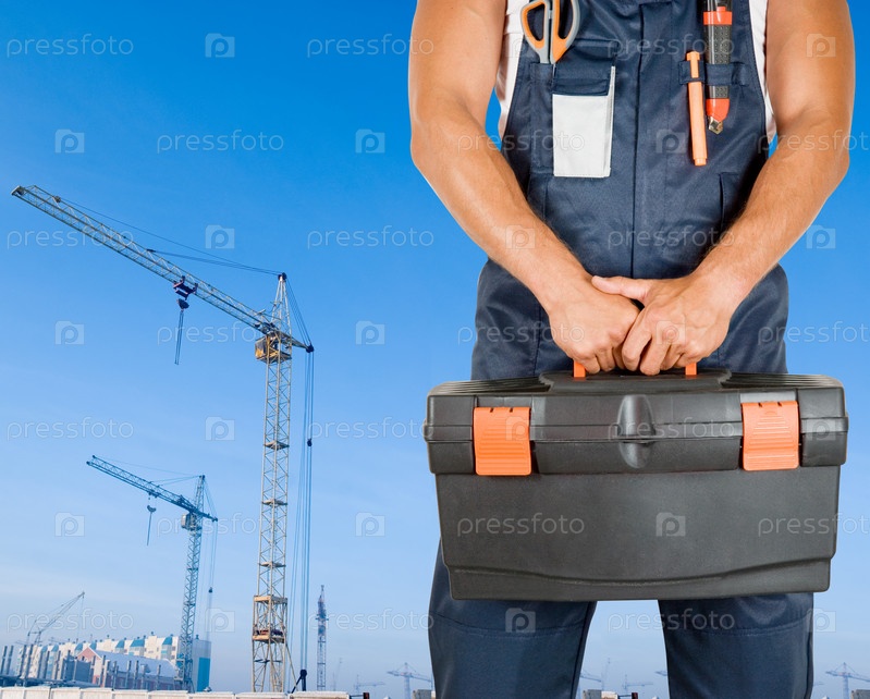Ремонтник с коробкой инструментов на фоне стройки