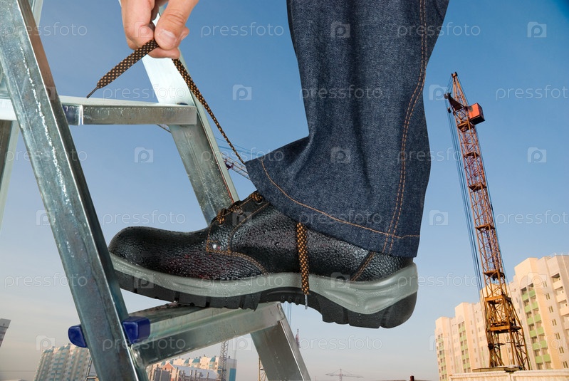 Нога в ботинке на стремянке на фоне стройки