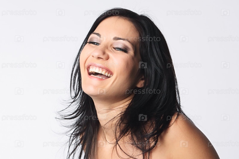 Портрет смеющейся молодой девушки на белом фоне