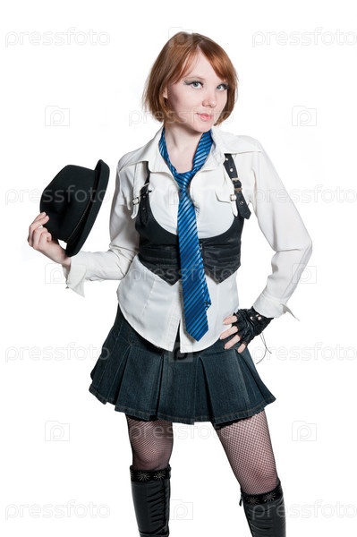 Портрет красивой молодой женщины в костюме гангстера на белом фоне