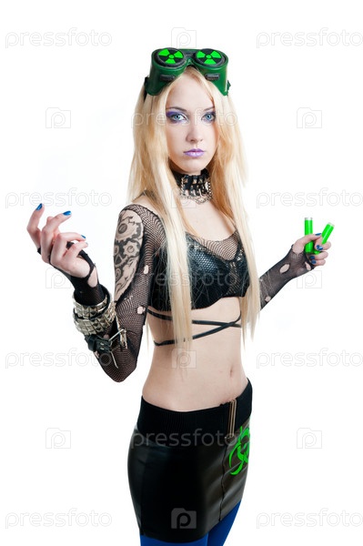 Портрет красивой молодой женщины в готическом костюме на белом фоне