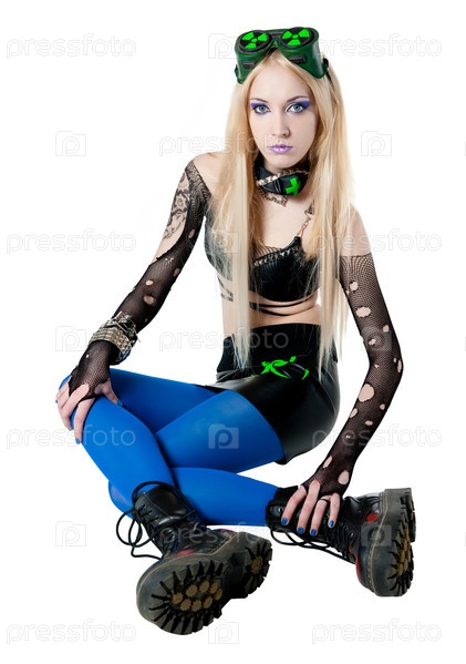 Портрет красивой молодой женщины в готическом костюме на белом фоне