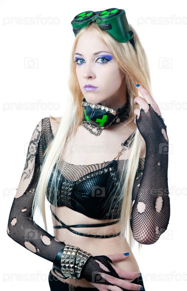 Портрет красивой молодой женщины в готическом костюме на белом фоне