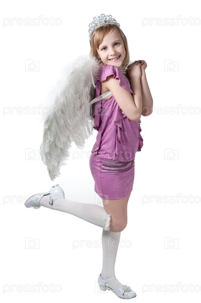 Портрет красивой девочки в платье и с крыльями на белом фоне