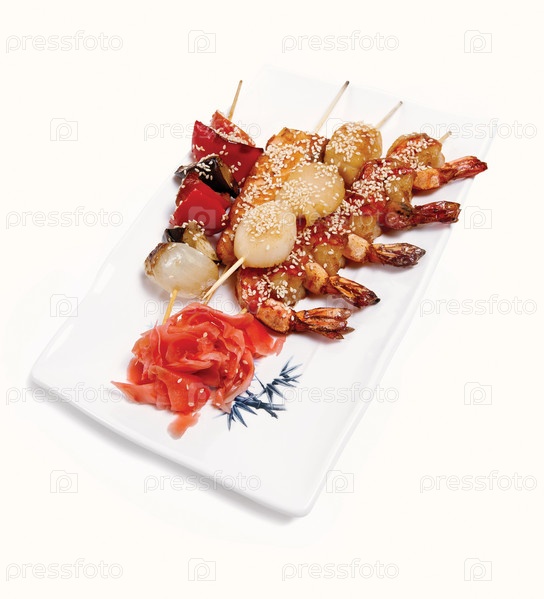 Блюдо из морепродуктов и мяса на белом фоне