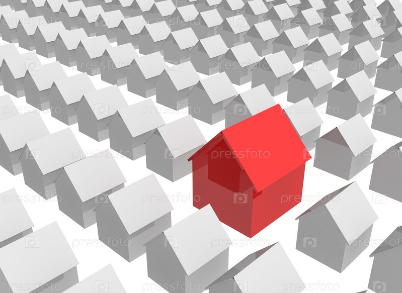 Ярко-красный домик среди типовых домов