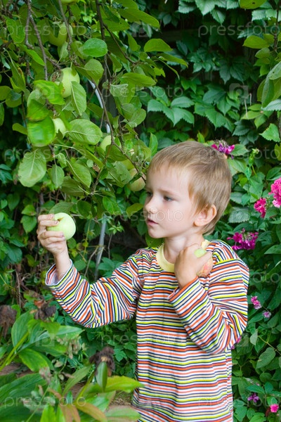 Мальчик собирает яблоки в саду