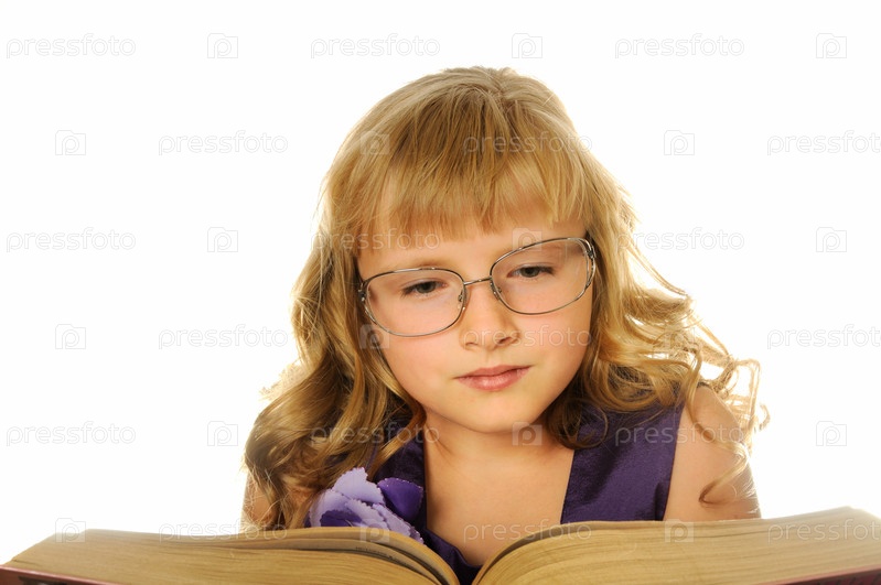 Маленькая красивая девочка в очках с книгой на белом фоне