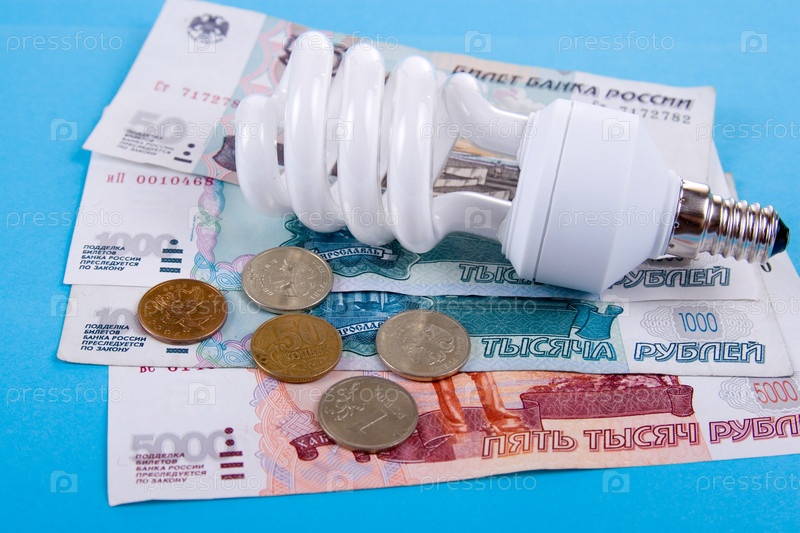 Энергосберегающая лампа и деньги на голубом фоне