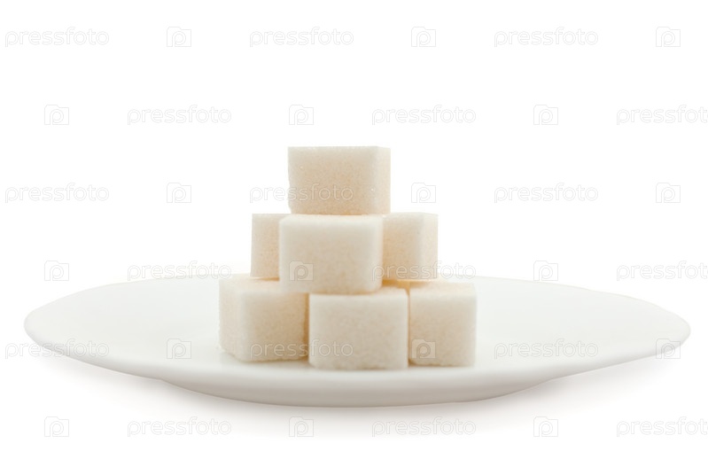 Сахарный рафинад на тарелочке, изолированный на белом фоне