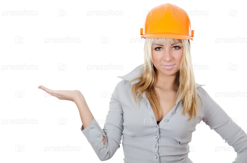 Портрет красивой молодой женщины в строительной каске на белом фоне
