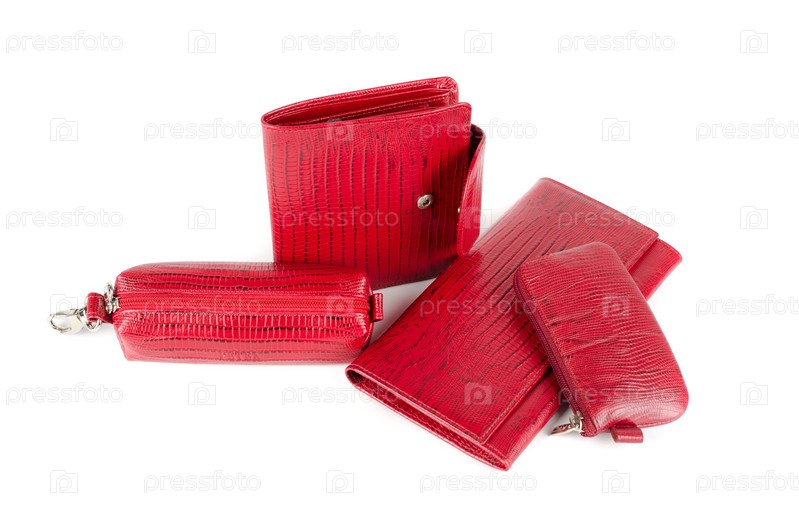 Красный женский кошелек, ключница и косметичка на белом фоне