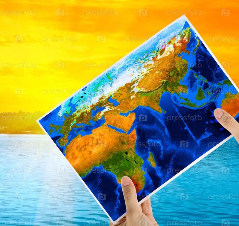 Руки с картой мира на фоне заката