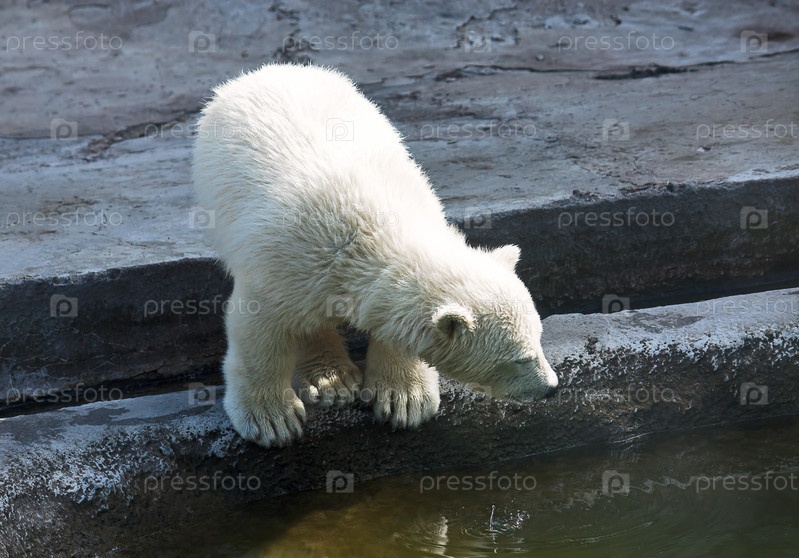 Маленький белый медведь в зоопарке возле водоема