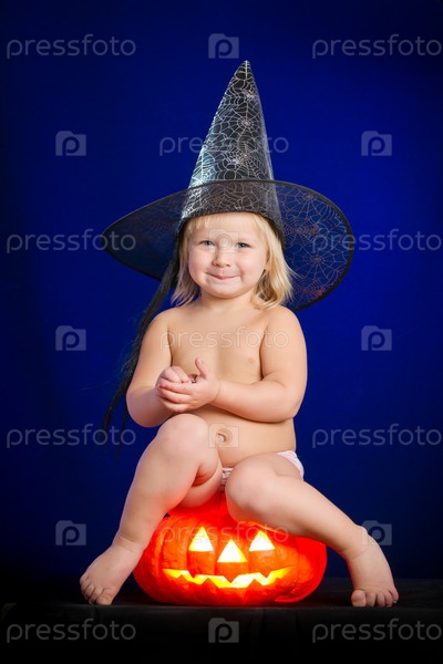 Маленькая девочка в черной шляпе сидит на фонаре Джека, Хеллоуин