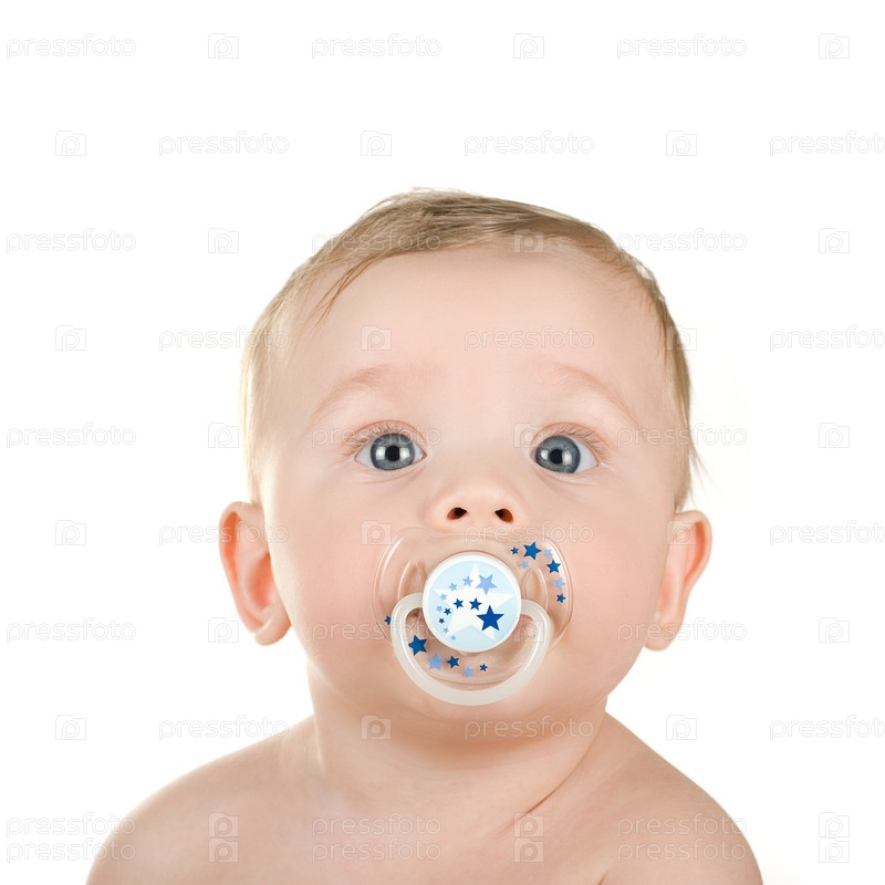 Маленький мальчик с соской на белом фоне