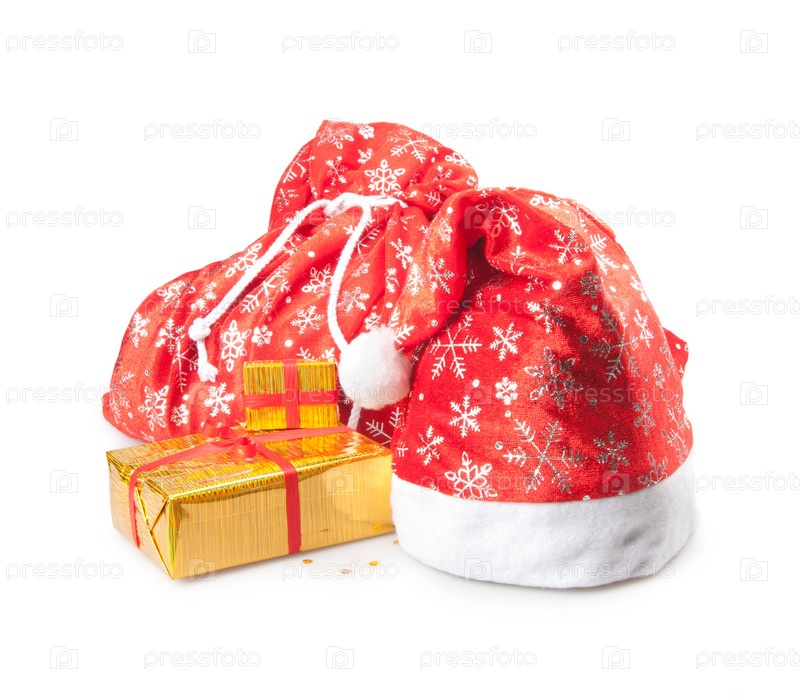 Мешок, новогодняя шапка и подарки на белом фоне