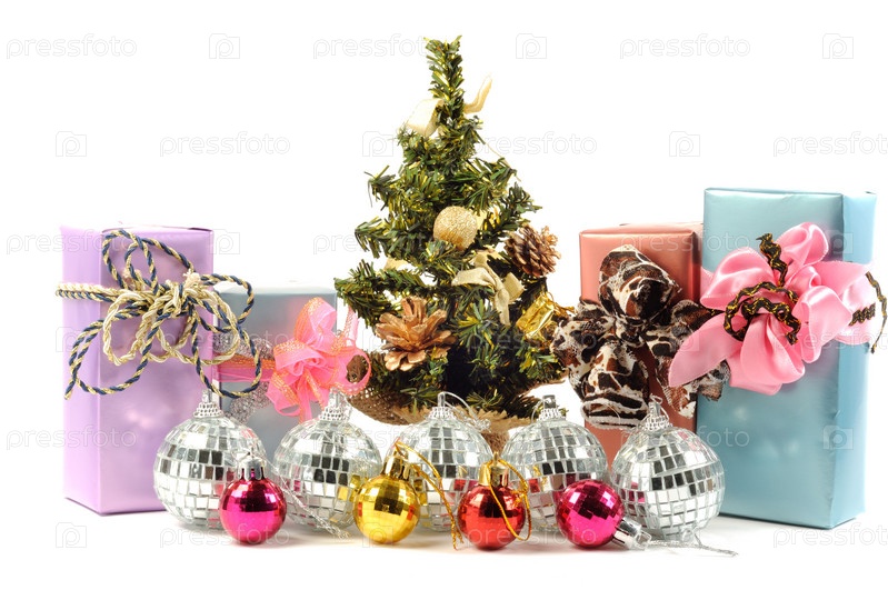 Маленькая новогодняя елочка, украшения и подарки на белом фоне