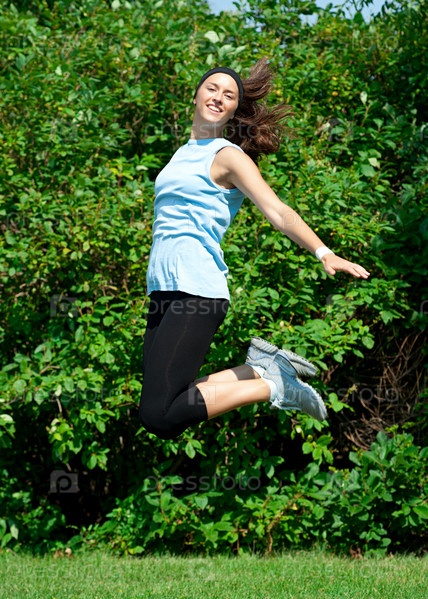 Молодая спортивная женщина прыгает и улыбается, на открытом воздухе
