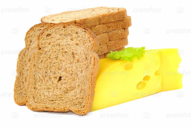 Нарезанный пшеничный хлеб и сыр на белом фоне