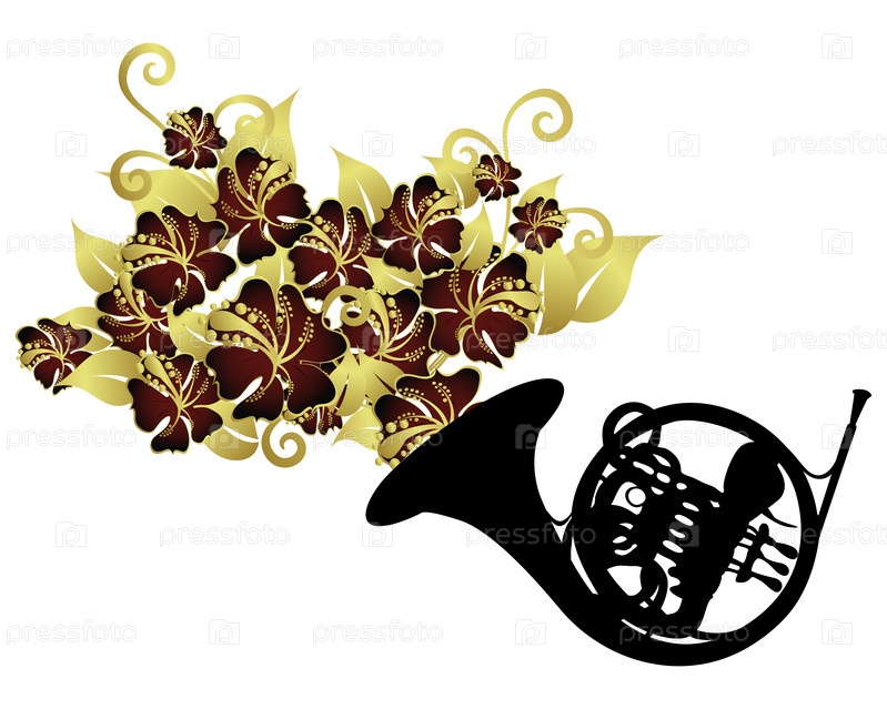 Цветочный узор и черный силуэт духовой трубы на белом фоне