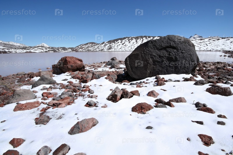 Озеро Эльбрусское, снег и камни на берегу